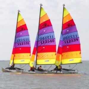 Groupes de 12 personnes, horaires en fonction des marées. Catamarans HobieCat 16 avec gréements standard et spi ou easy selon météo pour le perfectionnement.